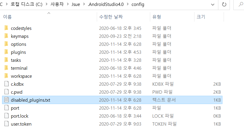 disabled_plugins.txt 삭제 후 안드로이드스튜디오를 재실행하면 간단하게 해결됩니다.